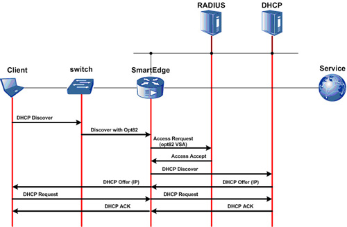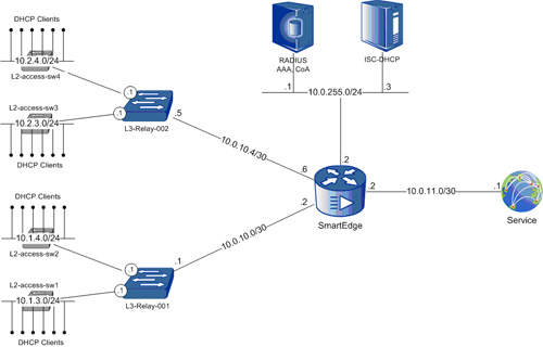 Отличительной особенностью SmartEdge является возможность работы с DHCP абонентами как через L2 сеть, так и через L3 сеть доступа. Участвуя в DHCP диалоге непосредственно, SmartEdge самостоятельно определяет то, как физически абонент взаимодействует с сетью: через L2 или через L3. В случае если сеть доступа L2, то единственное, что нужно гарантировать в сети доступа, это доставку посылаемых абонентами широковещательных запросов DHCP Discover до интерфейсов SmartEdge, т.е. SmartEdge и DHCP клиент должны находится в одном бродкастовом домене. SmartEdge для DHCP клиента в этом случае является IP шлюзом. В случае если есть доступа L3, то доставка DHCP Discover от клиента до SmartEdge осуществляется обычно при помощи L3 Relay-ев. Т.е. сеть доступа сегментирована L3 устройствами, клиент взаимодействует по L2 с сетью доступа как обычно, посылая бродкастовый DHCP Discover, который транслируется в юникаст ближайшим устройством L3 Relay, и доставляется до SmartEdge. С точки зрения DHCP, для клиента, L3 Relay является IP шлюзом, а IP адрес SmartEdge указывается в качестве DHCP сервера в настройках самого L3 Relay.