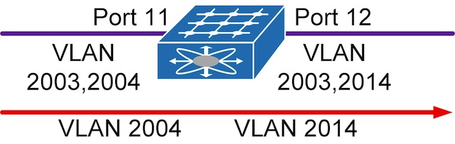 Ниже описан пример настройки двух VLAN. VLAN 2003 настраивается как обычный тегированный VLAN на портах 11 и 12 коммутатора, как представлено на схеме выше. Второй VLAN траслируется из 2004 в 2014 и обратно. На порту 11 коммутатора настраивается VLAN 2004, на порту 12 VLAN 2014, который попадая на порт 12 транслируется в VLAN 2004.