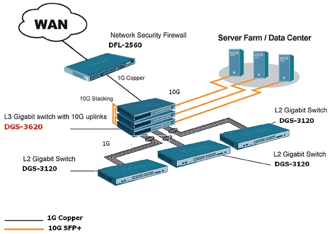 В качестве альтернативы виртуальному стеку, в зависимости от используемой топологии стекирования – линейной или отказоустойчивого «кольца», пользователи могут использовать один или два порта 10 Gigabit Ethernet SFP+, чтобы создать физический стек. В такой стек можно объединить до 12 коммутаторов серии DGS-3620 получить до 576 портов Gigabit Ethernet. Это позволяет обеспечить не только высокую пропускную способность стека, но и возможность управления расходами.