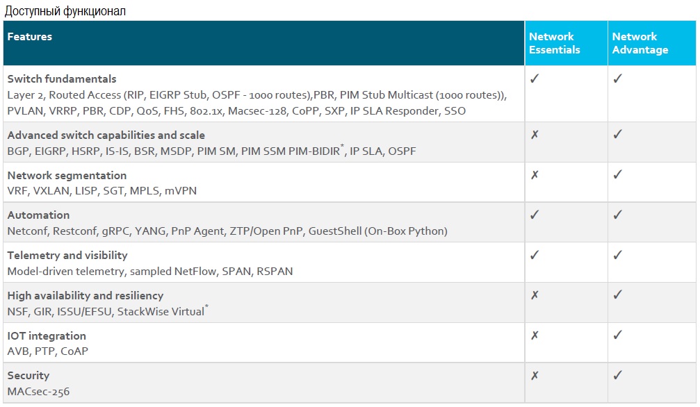 - Модули аплинка: C9500-NM-8X (8 портов 1/10GE (SFP / SFP+)) и С9500-NM-2Q (2 порта 40GE (QSFP+)), - подходят только для коммутаторов (С9500-16X и C9500-40X)