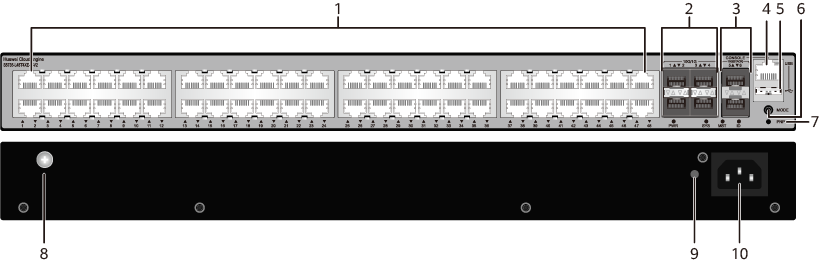 | 1. 48*10/100/1000BASE-T порты | 2. 4*1000BASE-X SFP порты |