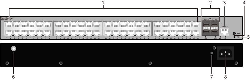 | 1. 48*10/100/1000BASE-T порты | 2. 4*1000BASE-X SFP порты |
