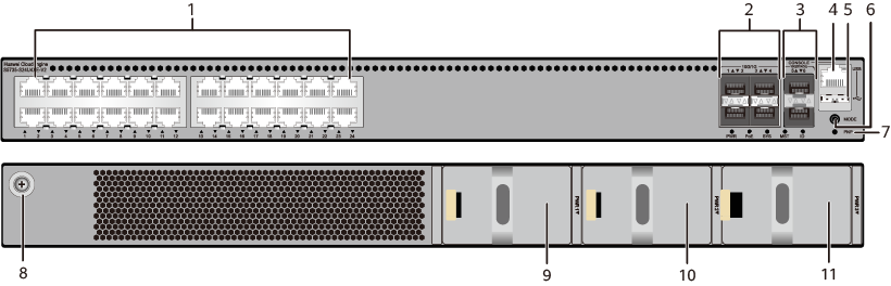 | 3. 4 порта 10GE SFP+ | 4. 2 порта стекирования |