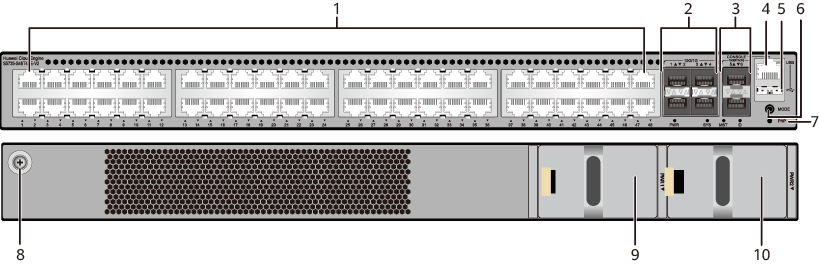 | 1. 48 портов 10/100/1000 BaseT | 2. 4 порта 10GE SFP+ |
