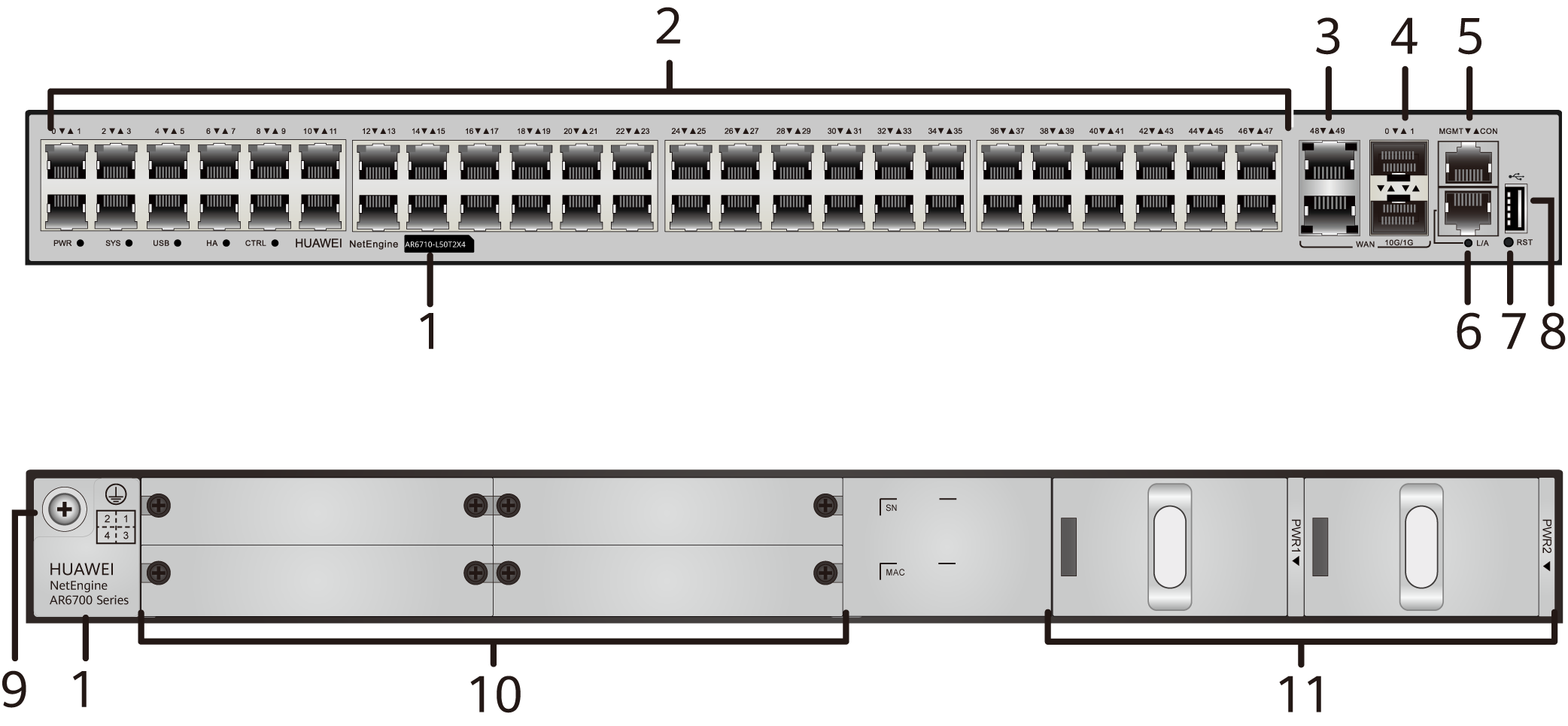 | 3. Интерфейсы WAN: два электрических интерфейса GE (GE48 - GE49) | 4.Два оптических интерфейса 10 GE (10GE0 - 10GE1) |