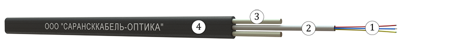 Кабель на основе оптического модуля, с двумя параллельными диэлектрическими силовыми элементами. Конструкция кабеля состоит из одного оптического модуля натурального цвета. Внутри оптического модуля расположено 1-16 одномодовых оптических волокон.