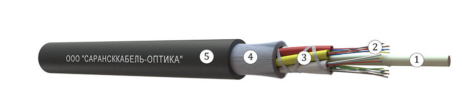 Кабель содержит сердечник модульной конструкции с центральным силовым элементом из стеклопластикового прутка, вокруг которого скручены (модули и кордели) методом правильной знакопеременной (SZ) скрутки. Внутри оптических модулей свободно уложены оптические волокна.