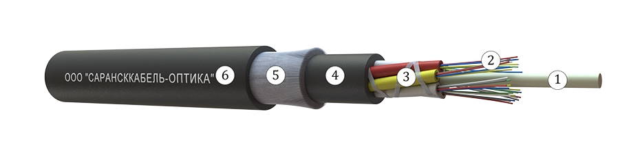 Свободное пространство внутри оптических модулей и межмодульное пространство заполнено гидрофобным гелем. Сердечник скреплен нитями. На сердечник наложена ПЭТ лента, закрепленная нитью. Поверх скрутки наложена промежуточная оболочка из полиэтилена. На промежуточную оболочку наложен армирующий повив из стеклонитей. Защитная оболочка – полиэтилен высокой плотности.