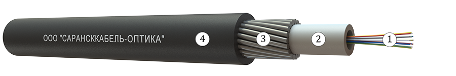 Кабель состоит из сердечника – модуля. Внутри оптического модуля свободно уложены оптические волокна. Свободное пространство внутри оптического модуля заполнено гидрофобным заполнителем. Поверх сердечника – модуля накладывается броня из стальных оцинкованных проволок. Свободное пространство между модулем и элементами бронепокрова заполняется гидрофобным компаундом. Поверх проволочной брони накладывается полиэтилен высокой плотности.