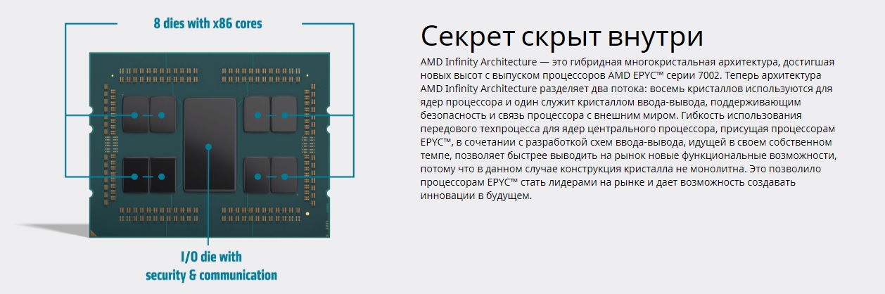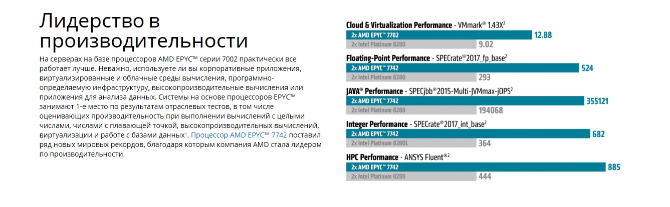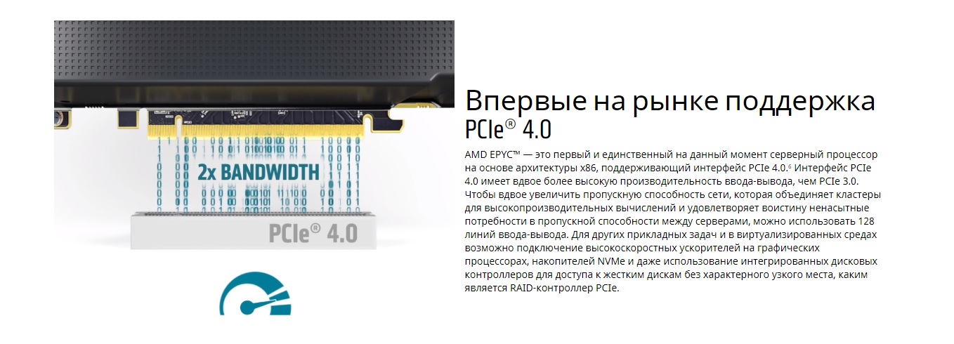 Компания AMD первой выпустила на рынок процессор на основе архитектуры x86, изготовленный с использованием техпроцесса 7 нм. Результатом удвоенной плотности ядер и оптимизации, позволившей повысить количество выполняемых за цикл инструкций, стал 4-кратный прирост производительности при выполнении вычислений с плавающей точкой, по сравнению с процессорами AMD EPYC™ 1-го поколения.