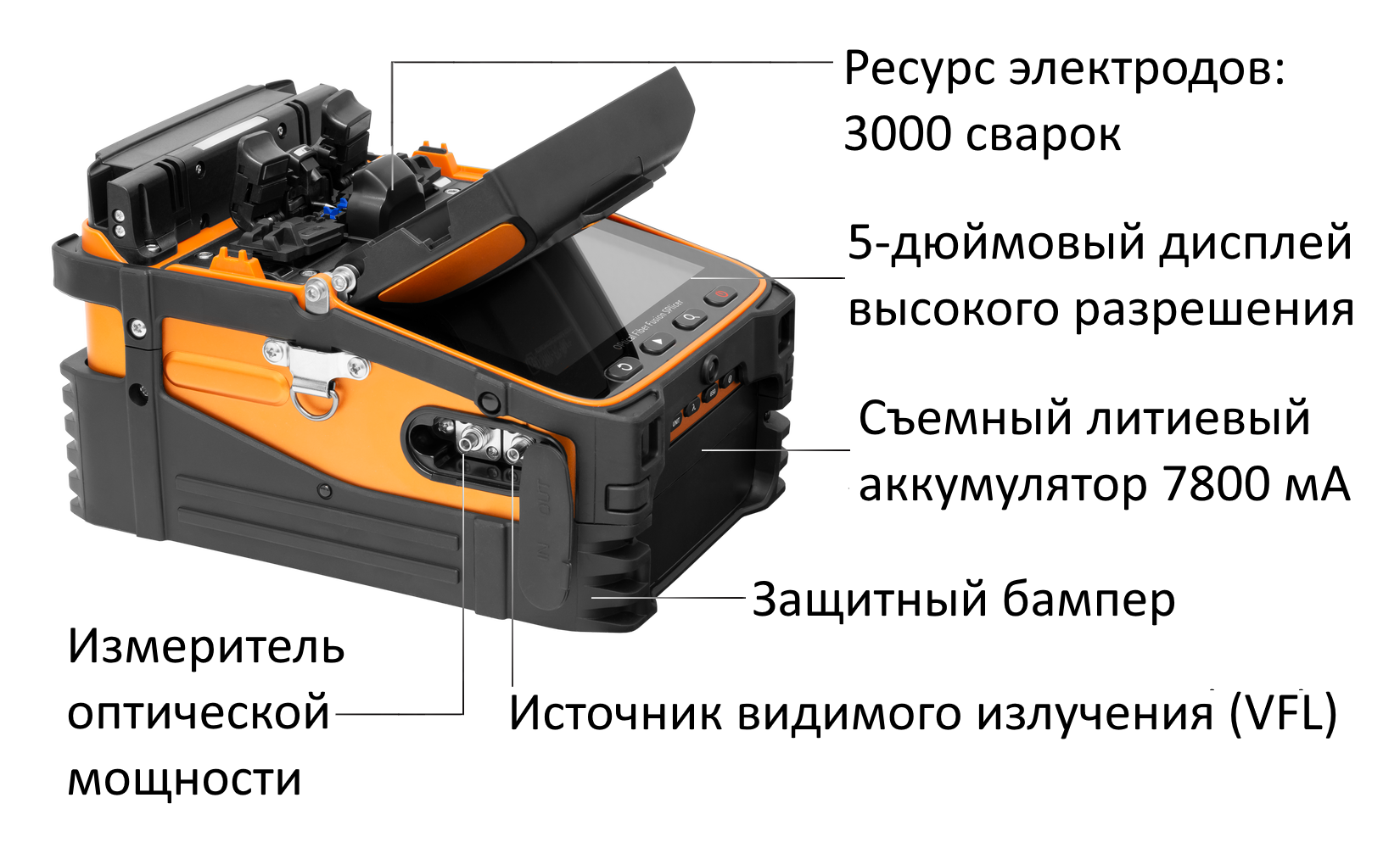 - 6 моторов, выполняющие высокоточное сведение оптических волокон по сердцевине