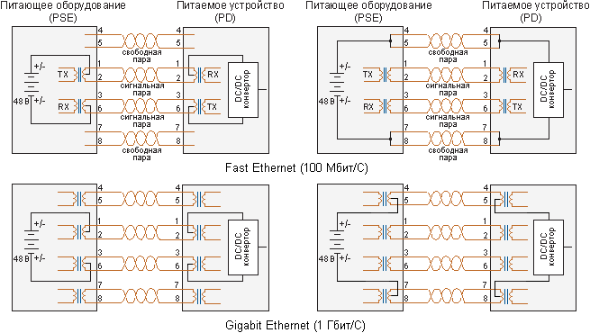 - Не имеют ограничений по току, передаваемому в питаемое устройство. Стандарт IEEE 802.3at предусматривает ток до 1,2А.