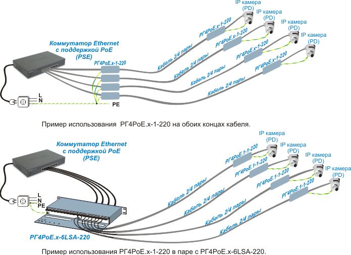 Предназначены для защиты оборудования, использующего среду передачи Ethernet 10/100Base-TX, поддерживающих технологию PoE (High Power Over Ethernet IEEE 802.3at), от опасных напряжений, возникающих в результате атмосферных разрядов (грозы) и индустриальных помех. Стандарт IEEE 802.3at предусматривает две схемы организации дистанционного питания для сетей Ethernet. Устройства РГ4РоЕ поддерживает обе схемы.