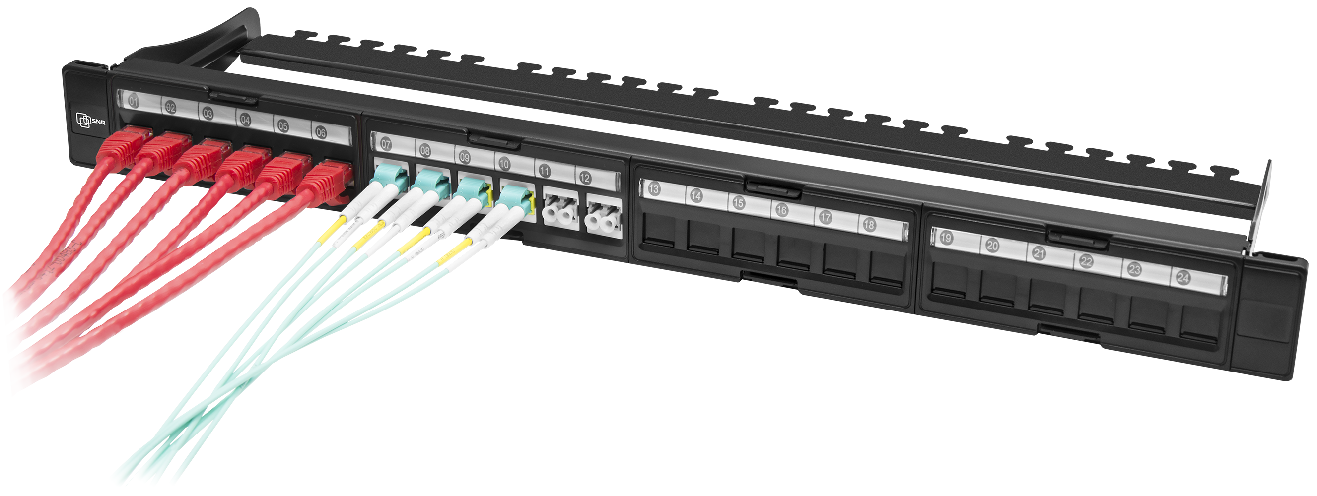SNR-UL-1U24-D - наборная патч-панель, выполненная в неэкранированном исполнении, предназначена для установки в 19" шкаф или стойку. Патч-панель имеет свободных 24 порта (со шторками), в которые устанавливаются модули Keystone.
