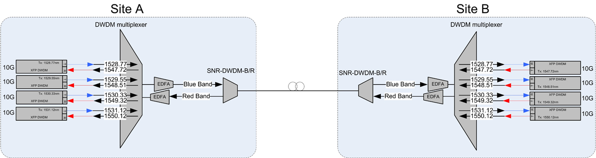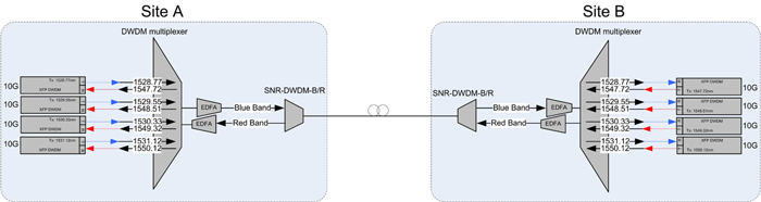 SNR-DWDM-B/R разделяет C-диапазон длин волн на два поддиапазона: «Blue» (1528...1543нм) и «Red» (1547...1564нм), тем самым позволяет применять EDFA-усилители для DWDM-магистралей в схеме включения по одному оптическому волокну. При этом на одной стороне используются оптические DWDM модули из поддиапазона “Blue”, а на другой из “Red”.