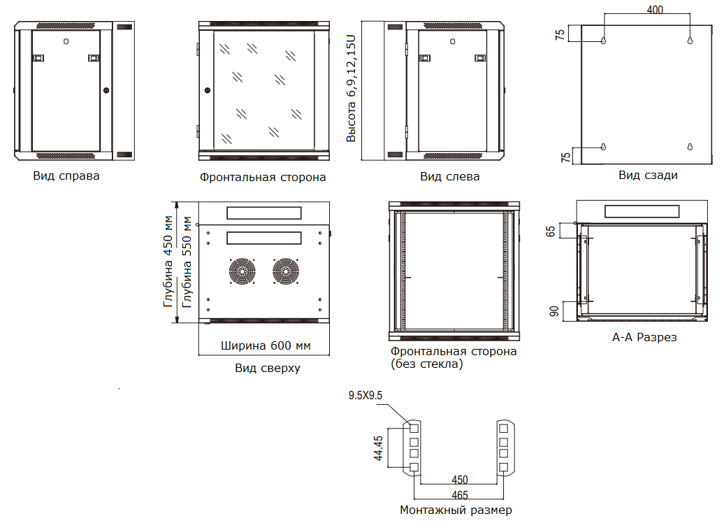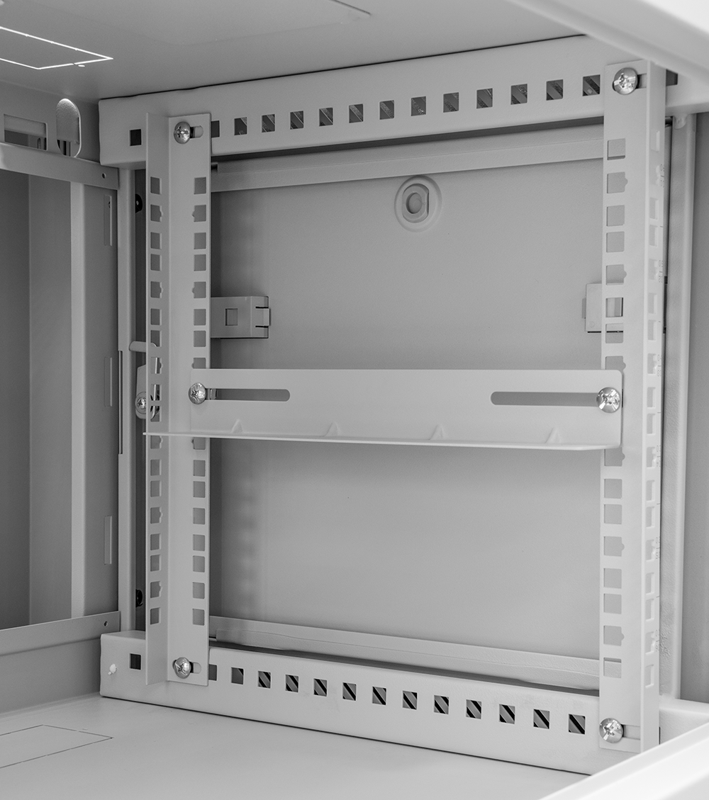 В комплекте идут монтажные вертикальные направляющие для крепления стандартного 19 дюймового оборудования. Направляющие пронумерованы в соответствии с количеством юнитов, для упрощения процесса монтажа. Направляющие регулируются по глубине. Доступ к оборудованию, устанавливаемому в шкафу, может осуществляться с четырёх сторон. Шкаф поставляется в разобранном виде, цвет шкафа RAL 7035 (серый).