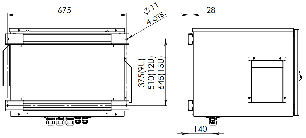 отверстия 11 мм. Ввод кабеля осуществляется через съемную заглушку в основании шкафа.