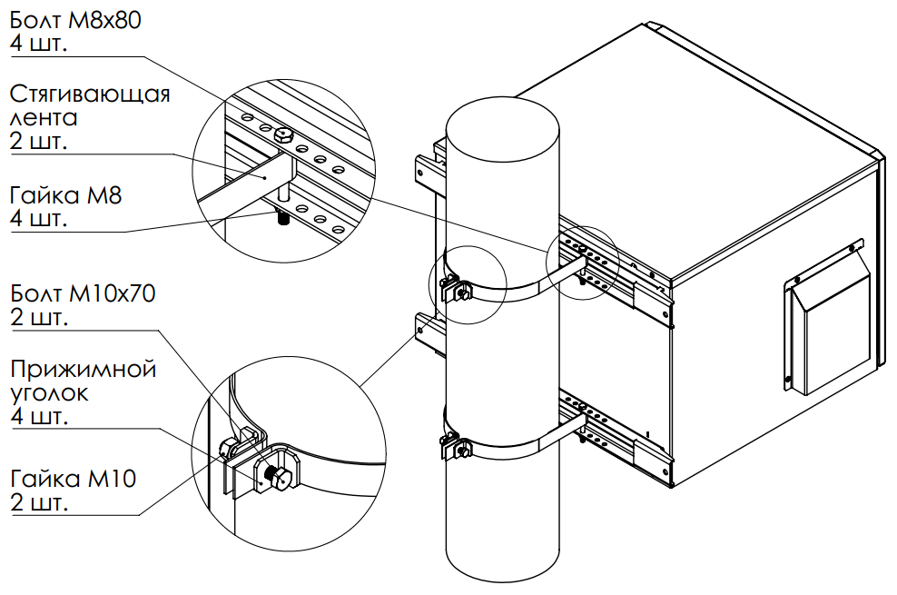 Шкаф устанавливается на столб при помощи комплекта из стягивающей ленты и крепежей (комплект приобретается отдельно).