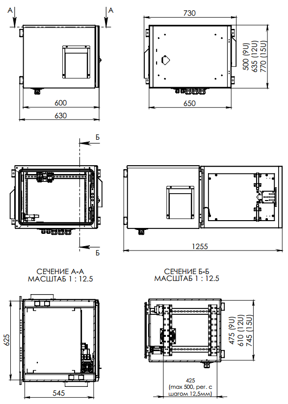 Корпус шкафа имеет сварную металлическую конструкцию, внутри покрыт термоизоляционным негорючим материалом. В основании шкафа предусмотрена съемная заглушка для ввода кабеля. Регулируемые по глубине 19'' направляющие толщиной 1,5 мм.