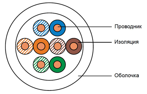 Витая пара (Twisted Pair) — кабель связи, в основном применяемый для организации структурированных кабельных систем (компьютерных сетей, телефонных сетей). Кабель выполнен в виде свитых попарно изолированных проводников. Номенклатура витой пары очень обширна – от одной витой пары до нескольких десятков. В многопарном кабеле, кроме свивки двух проводников между собой, скручиваются сами пары. Такая конструкция витой пары сделана не случайно, это позволяет снизить негативное влияние электромагнитных помех на сигнал, передаваемый по кабелю.