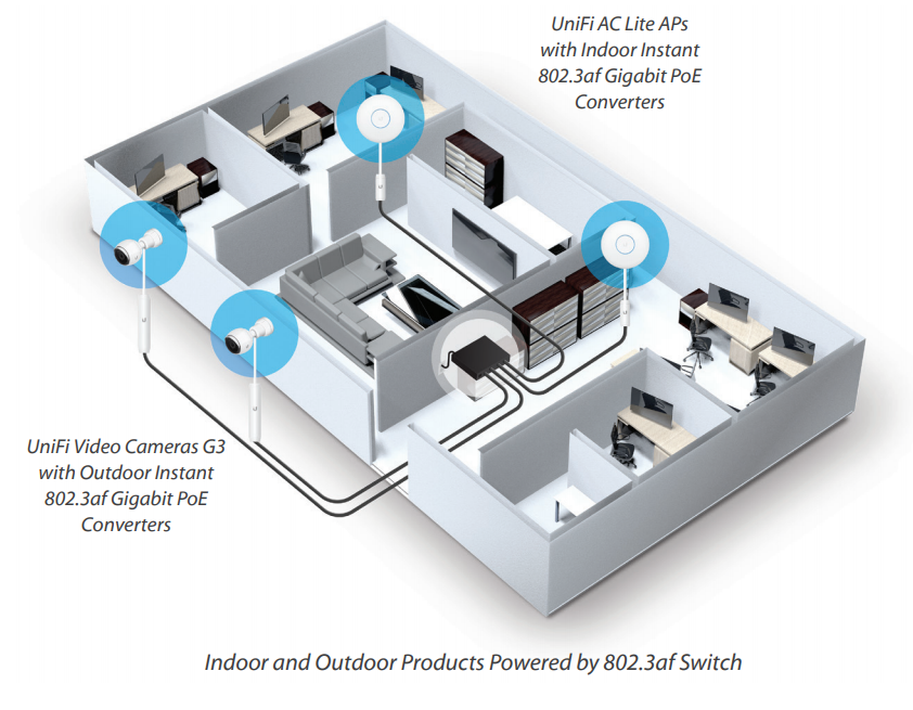 Gigabit PoE-преобразователь Ubiquiti Instant 802.3af Outdoor Gigabit - превращает любое устройство Ubiquiti линеек UniFi, UniFi Video, AirMax с питанием по витой паре PoE 24V в 802.3af-совместимое устройство.