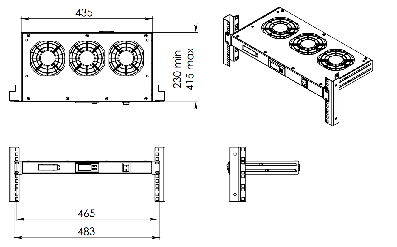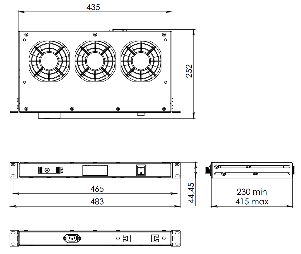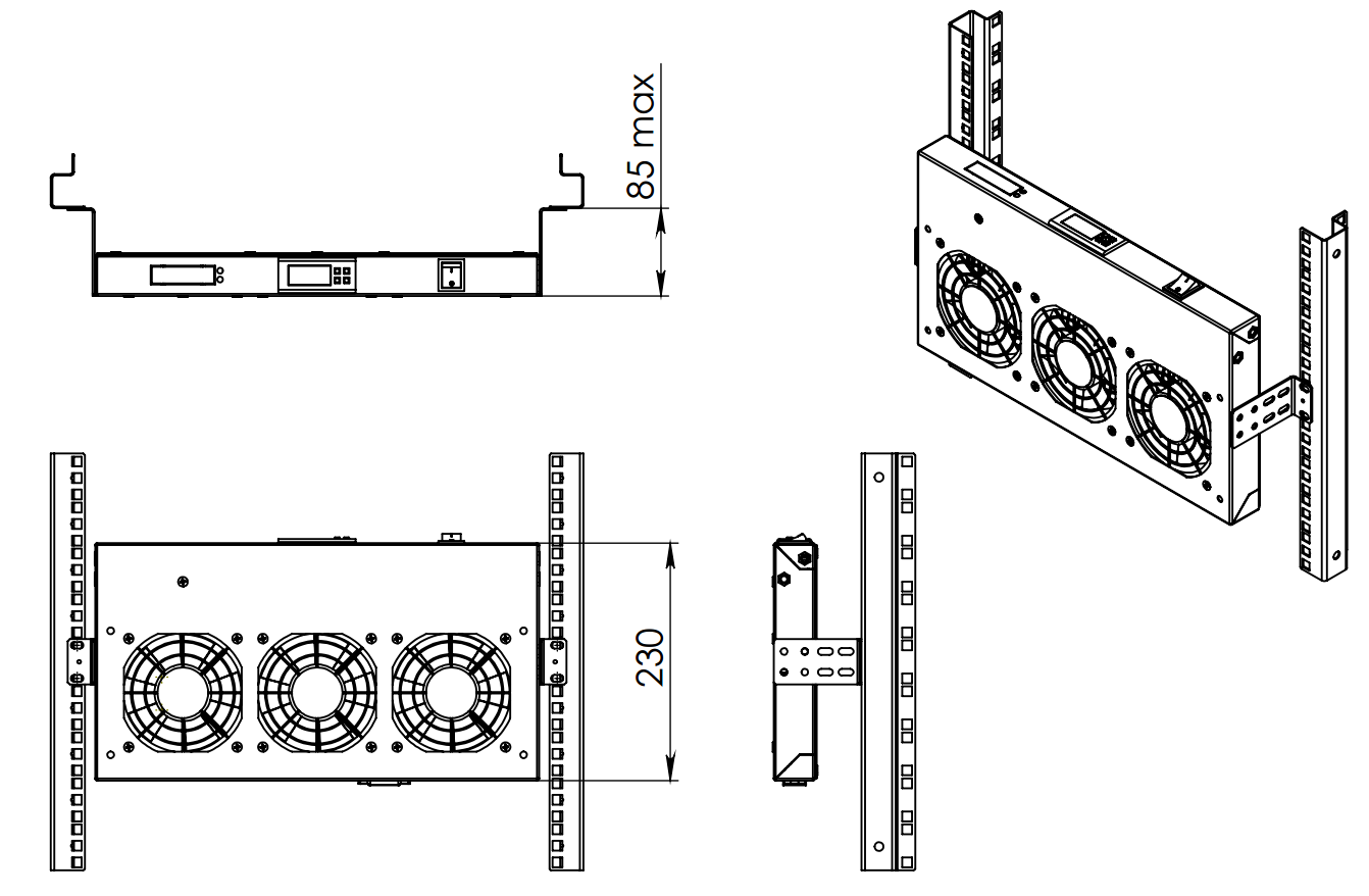 Модуль вентиляторный 19" монтируется в двух точках при помощи кронштейнов на монтажные направляющие шкафа в горизонтальном и вертикальном положении. Универсальные кронштейны для установки в горизонтальное положение регулируются по глубине 230-415мм.
